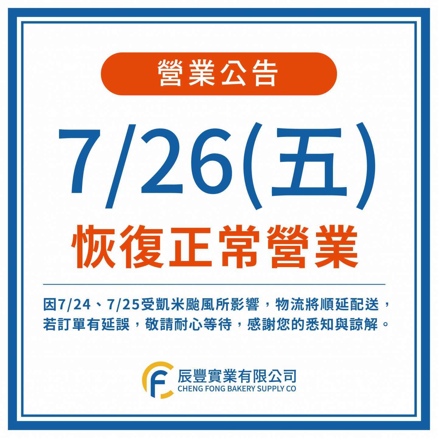 📢今日7/26(五)辰豐“恢復正常營業”
