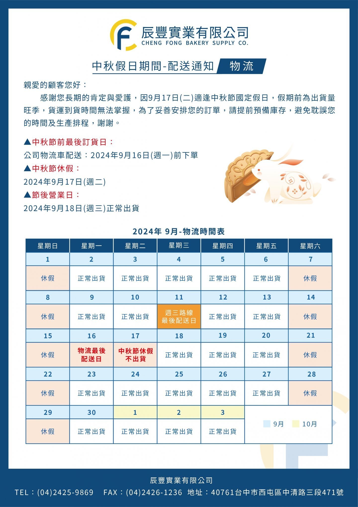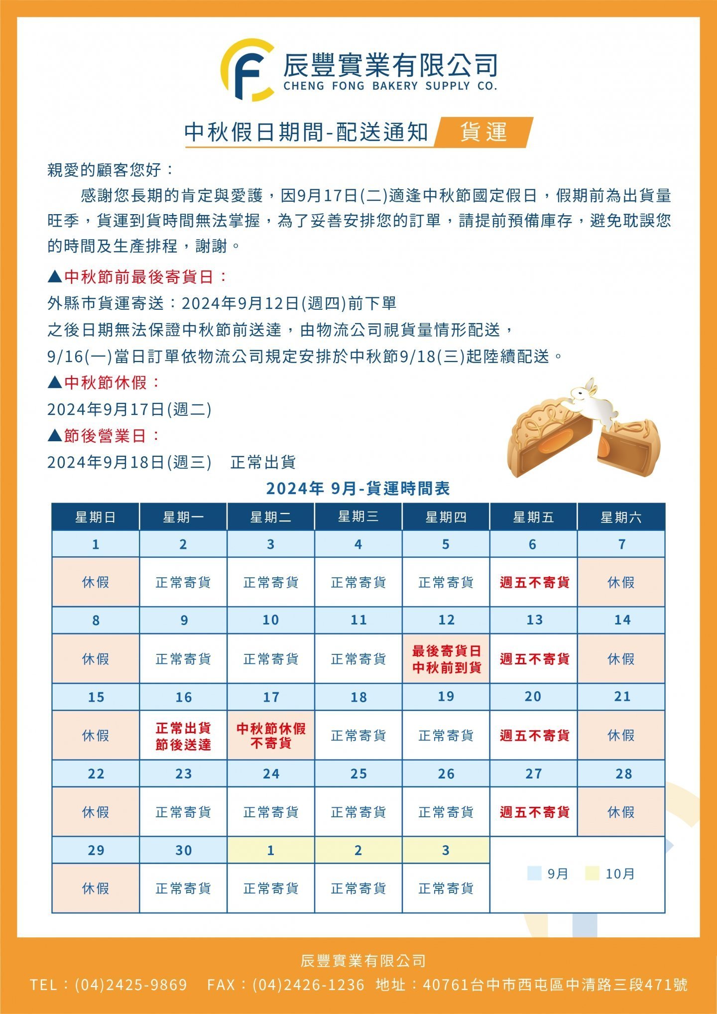 之後日期無法保證中秋節前送達,由物流公司視貨量情形配送,9/16(一)當日訂單依物流公司規定安排於9/18(三)中秋後陸續配送。