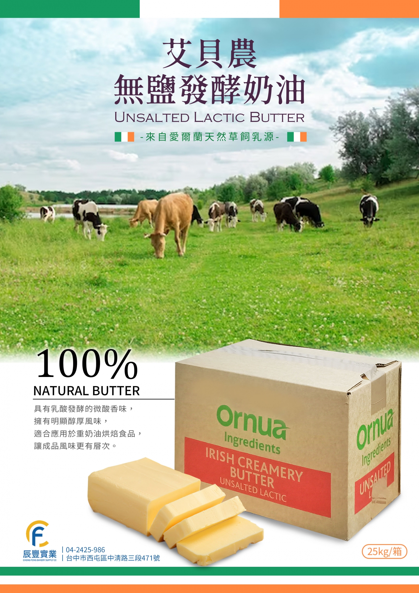 來自愛爾蘭天然草飼乳源,100%天然奶油,具有乳酸發酵的微酸香味,擁有明顯醇厚風味,適合應用於重奶油烘焙食品,讓成品風味更有層次。