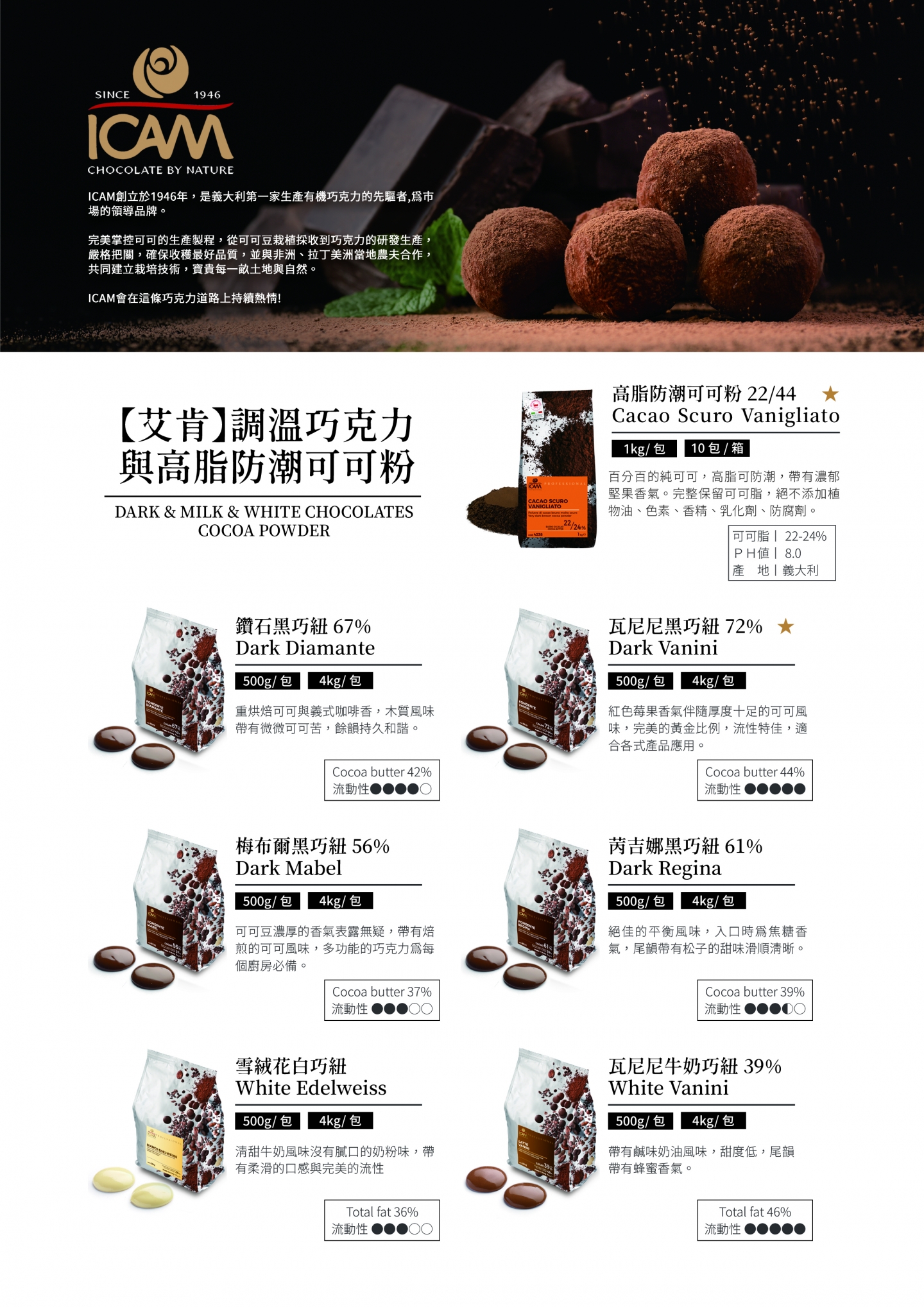 紅色莓果香氣伴隨著厚度十足的可可風味,完美的金黃比例,流動性特佳,適合各式產品應用。