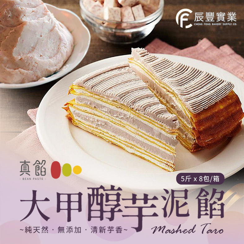 使用百分之百台灣新鮮大甲芋頭,無色素無香料,清新芋香、色澤自然,完美呈現芋頭風味與色澤,可用於甜品、飲料類,且可添加奶油將餡料調整它的軟硬度。