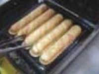 麵糰放入煎烤機內,待表面著色後,可掀蓋翻面再繼續煎烤。