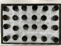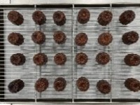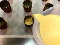 每盤24個烤模於內部均勻噴上烤盤油,麵糊回溫至10~15℃左右再倒入模具,每個模具倒入70~75g可麗露麵糊,約模具8~9分滿。