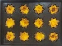 出爐成品於室溫冷卻,倒扣脫模於烤盤上,再將蛋塔翻正。